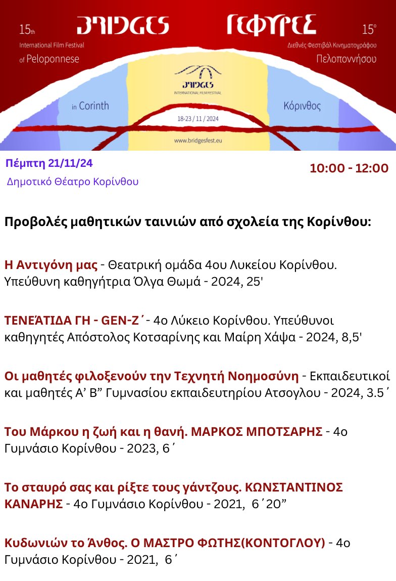 14 Νοέ Προβολές μαθητικών ταινιών από σχολεία της Κορίνθου Posted at 17:44h in Μαθητικές Ταινίες Κόρινθος 2024 by Julia